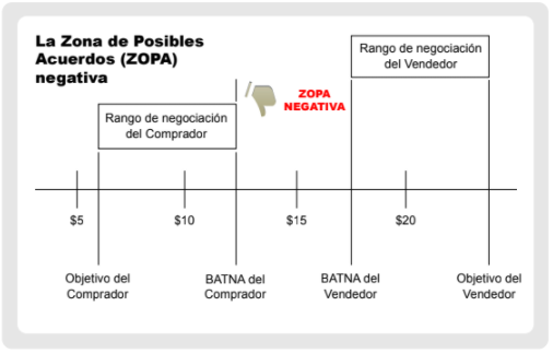 El objetivo de toda negociación es llegar a un acuerdo lo más favorable para uno mismo sin renunciar, a priori, a ningún trozo de la “tarta”. ¿Qué es la ZOPA? La Zona de Posibles Acuerdos (ZOPA) es la región que se encuentra entre los BATNA (la mejor alternativa a un acuerdo de negociación) de cada una de las partes. El acuerdo final estará en algún punto por encima del BATNA del vendedor y por debajo del BATNA del comprador. Como se puede ver en las siguientes ilustraciones, la Zona de Posibles Acuerdos (ZOPA) puede ser positiva o negativa: