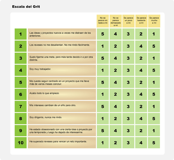 Lo que salió de estas preguntas fue la Escala del Grit, un test que al responderlo con sinceridad evalúa hasta qué punto abordamos la vida con grit.