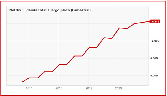 Deuda que acumula Netflix en billones (americanos) de dólares ($16.310 millones a finales 2020))