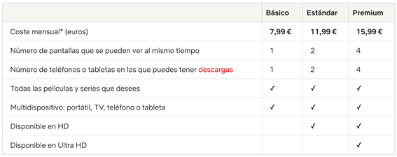 Hay tres planes de suscripción en función del número de dispositivos con el que reproducir el contenido de forma simultánea o la resolución del mismo. No hay restricciones en el catálogo de una a otra.