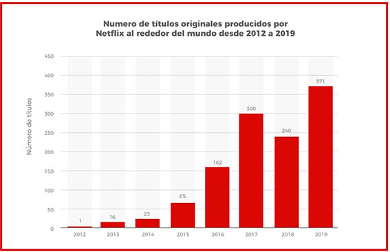 Las previsiones de inversión para nuevos títulos originales en 2020 fueron de 17 000 millones de dólares, más del doble que en 2015 (8.000 millones de dólares). En mercados como La India, Netflix ha destinado a sus producciones cerca de 400 millones de dólares. Tratan de consolidar su crecimiento internacional localizando sus contenidos en distintos países para fidelizar a los clientes internacionales.