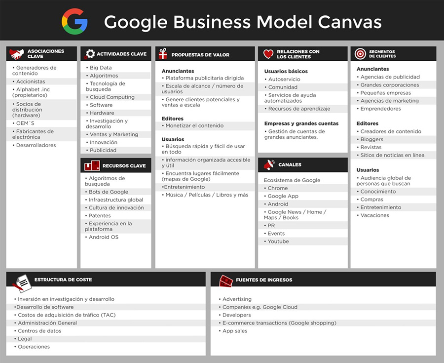 Para profundizar más en este tema, es necesario conocer a profundidad cómo funciona Google. Para ello, vamos a analizar su modelo de negocio a través del Business Model Canvas.