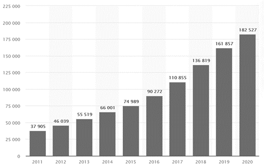 Ingresos de Google (Alphabet) desde 2011 al 2020 (en millones de dólares)