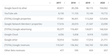 Ingresos por Segmento de Google (Alphabet) desde 2017 al 2020 (en millones de dólares)