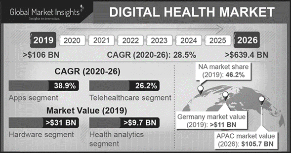 El tamaño del mercado de salud digital se estimó en más de $106,000 millones en 2019 y la industria tendrá un crecimiento anual compuesto en 28.5 % hasta 2026, alcanzando los $639,000 millones de dólares. Asimismo, la pandemia por COVID aumentó la adopción de tecnologías de salud digital e impulsará el crecimiento de la industria globalmente.