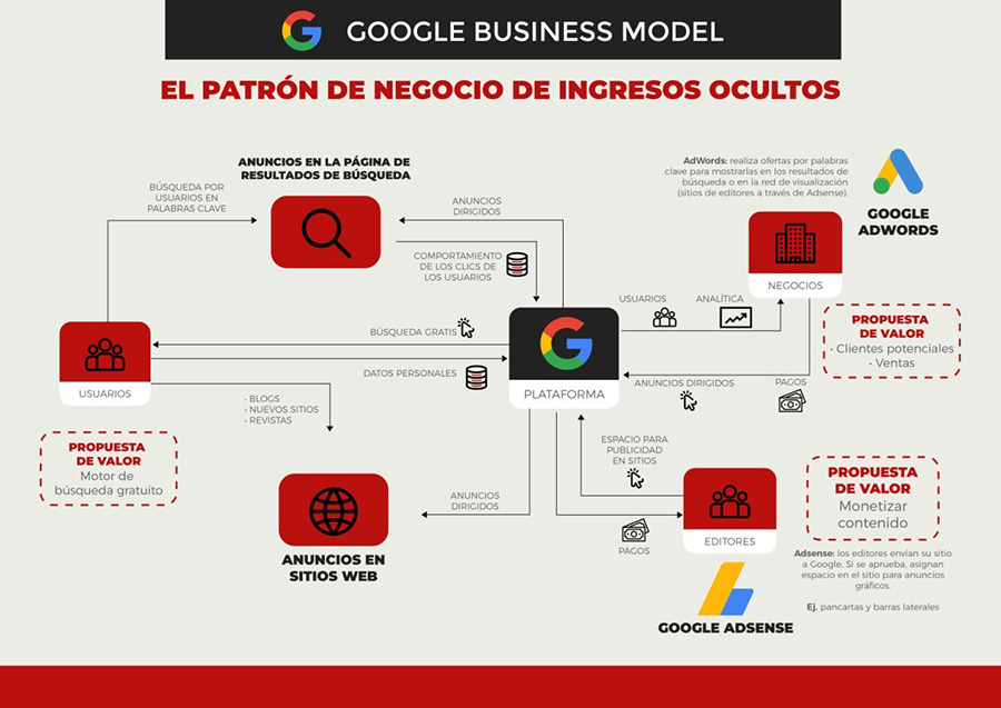 La propuesta de valor para los usuarios es el uso gratuito del motor de búsqueda de Google y el resto de sus herramientas (g-mail, drive, maps, etcétera).