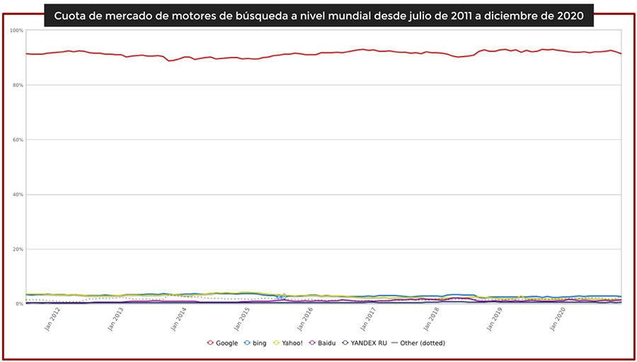 En sus inicios, Google solo era un motor de búsqueda. Y dada su efectividad a la hora de mostrar información relevante al usuario gracias a su algoritmo único, se posicionó como el buscador más importante de todos, desbancando al entonces líder Yahoo!