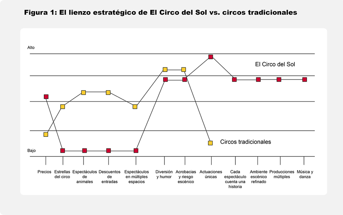 Volviendo al ejemplo del Circo del Sol, veamos cómo sería el lienzo estratégico de este caso. Si observamos la Figura 1, el eje horizontal nos muestra los factores competitivos que conforman este sector en cuestión: el precio, las estrellas que participan en las representaciones, los espectáculos de animales, los descuentos sobre el precio de las taquillas, los elementos artísticos y musicales, etc. Tanto el Circo del Sol como los circos tradicionales dan una importancia relativa distinta a cada uno de estos factores. Por eso, en el lienzo visual que representa la Figura 1, cada punto denota mayor o menor importancia según sea la estrategia adoptada. Uniendo cada uno de esos puntos tendríamos nuestro cuadro estratégico.