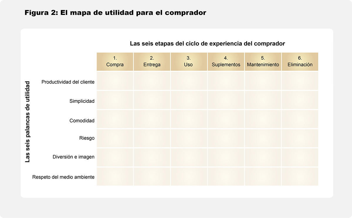 El mapa de la utilidad para el comprador ayuda a los directivos a contemplar este asunto desde la perspectiva correcta (ver Figura 2). Allí se representan todas las palancas que las compañías pueden activar a fin de ofrecer una utilidad excepcional a los compradores así como las diversas experiencias que estos pueden tener con un producto o servicio. Este mapa permite a los directivos identificar toda una gama de espacios de utilidad que un producto o servicio puede llenar.